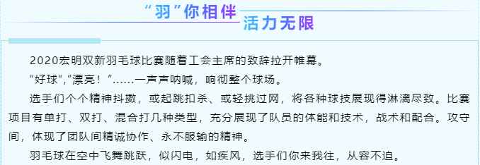 ? ? ? ?為豐富員工業(yè)余生活,讓員工們“玩起來”、“動起來”、“樂起來”。近期,宏明雙新各運(yùn)動協(xié)會紛紛開展了比賽,隊(duì)員們在比賽中揮灑汗水,盡情享受著運(yùn)動帶來的快樂。